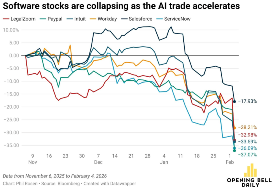 En Wall Street crece la narrativa de un “SaaS-pocalipsis”: el entusiasmo por la inteligencia artificial está volviéndose pesimismo para el software tradicional. Varias empresas de software empresarial y de servicios —como Salesforce, ServiceNow, Intuit y LegalZoom— registraron caídas ante el temor de que nuevas herramientas de inteligencia artificial sustituyan funciones completas de sus plataformas. También retrocedieron firmas de tecnología educativa como Duolingo y Chegg. El detonante reciente fue el lanzamiento de nuevas soluciones legales basadas en inteligencia artificial por parte de desarrolladores líderes del sector, que sugieren que tareas especializadas antes cubiertas por software vertical podrían ser absorbidas por modelos avanzados.