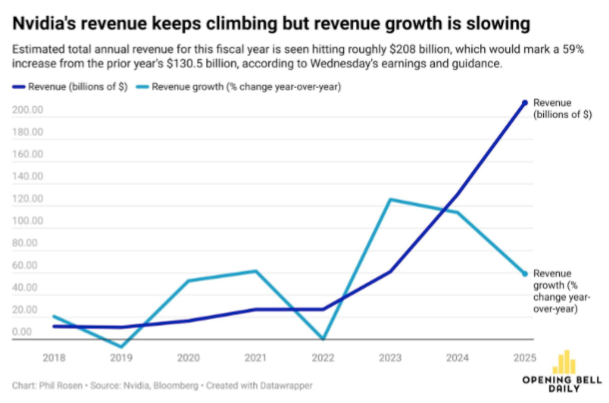 Aun así, el ritmo de expansión muestra señales de normalización. Aunque Nvidia prevé ingresos anuales de alrededor de 208 mil millones de dólares —un avance de 59% frente al año anterior— este crecimiento es sustancialmente menor al 114% previo, lo que abre la puerta a inquietudes sobre si la empresa podrá mantener su historial de resultados extraordinarios. La pregunta ya ronda a los inversionistas: en un entorno donde la demanda sigue siendo sólida pero el tamaño de la compañía se ha vuelto colosal, ¿qué ocurrirá el día en que “deje de aplastar” las expectativas con la misma contundencia? (ODB)