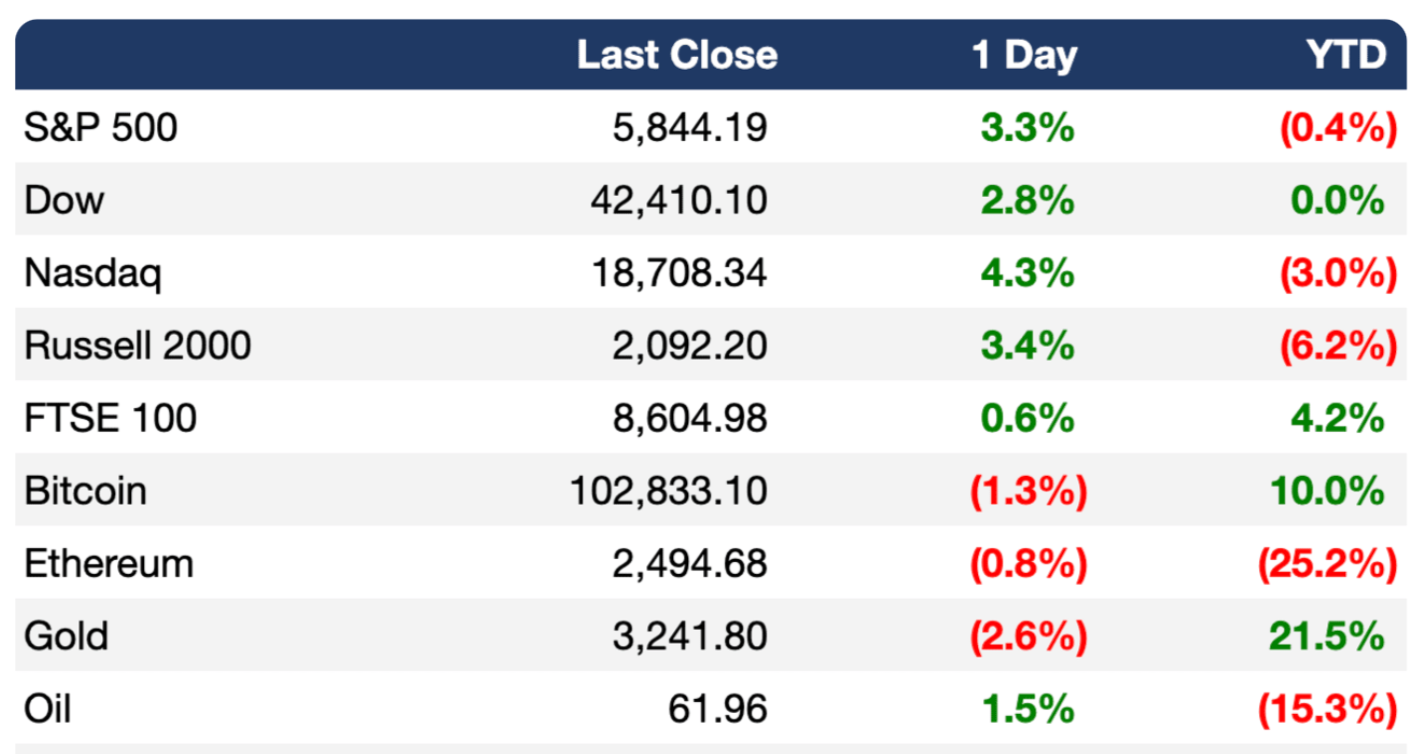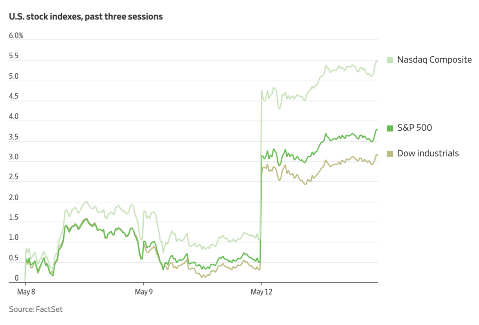 Wall Street celebró con entusiasmo la tregua comercial entre Estados Unidos y China, impulsando al Dow Jones más de 1,100 puntos y llevando al S&P 500 y al Nasdaq a subidas de 3.3 % y 4.3 %, respectivamente. El acuerdo, que reduce sustancialmente los aranceles y aporta claridad al rumbo económico, marca un giro hacia un enfoque más selectivo en política comercial. Trump lo describió como un “reinicio total” en la relación bilateral, mientras advierte que, de no alcanzarse un acuerdo en 90 días, las tarifas subirán, aunque sin regresar al nivel de 145 %, pues eso implicaría una ruptura total. China, por su parte, reafirmó su apuesta por el multilateralismo y lanzó críticas veladas al unilateralismo estadounidense, en un momento en que busca afianzar su lugar como potencia global. (WallStreetBreakfast)