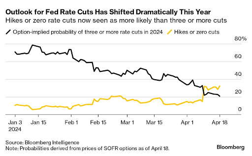 Los índices accionarios han subido este año (y el anterior) pero eso se debe en gran medida a las expectativas de que la Reserva Federal reduzca las tasas de interés. Los pronósticos hace un mes eran del 55% de probabilidades de un recorte en junio. Ahora rondan el 16%.