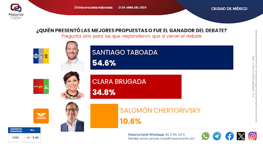 Encuesta Mitofsky en la CDMX: Clara Brugada 53.3%; Santiago Taboada 39.4% y Salomón Chertorivski 7.3%. (ECO)