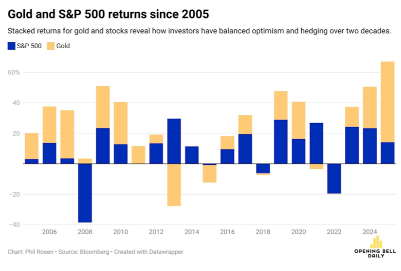 El oro vive su mejor año en décadas, pero en un contexto anómalo: su precio supera al S&P 500 en más de 35%, una brecha comparable solo con crisis como la de 2008, la deuda europea de 2011 o la pandemia de 2020. Lo inusual es que ahora el metal brilla en medio de un ciclo alcista bursátil (debería moverse en sentido contrario, no paralelo), cuando tradicionalmente su auge refleja miedo y aversión al riesgo. Según DataTrek Research, el oro rinde 1.5 desviaciones estándar por encima de su promedio histórico frente a las acciones, sin precedentes en los últimos veinte años.