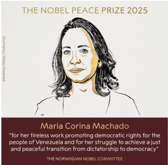 El premio Nobel de la Paz 2025 es para María Corina Machado por su incansable labor en la promoción de los derechos democráticos del pueblo de Venezuela y por su lucha por lograr una transición justa y pacífica de la dictadura a la democracia.