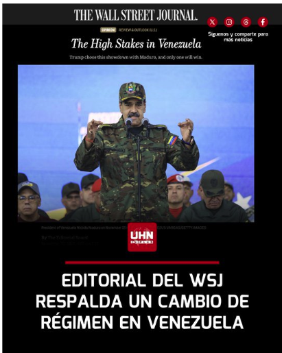 El diario afirma que, aunque Trump no lo diga explícitamente, el objetivo es el cambio de régimen, considera que derrocar a Maduro es un interés nacional para Estados Unidos, y asegura que si el chavista huye y la oposición asume, sería “un paso gigante para la libertad en la región”.
