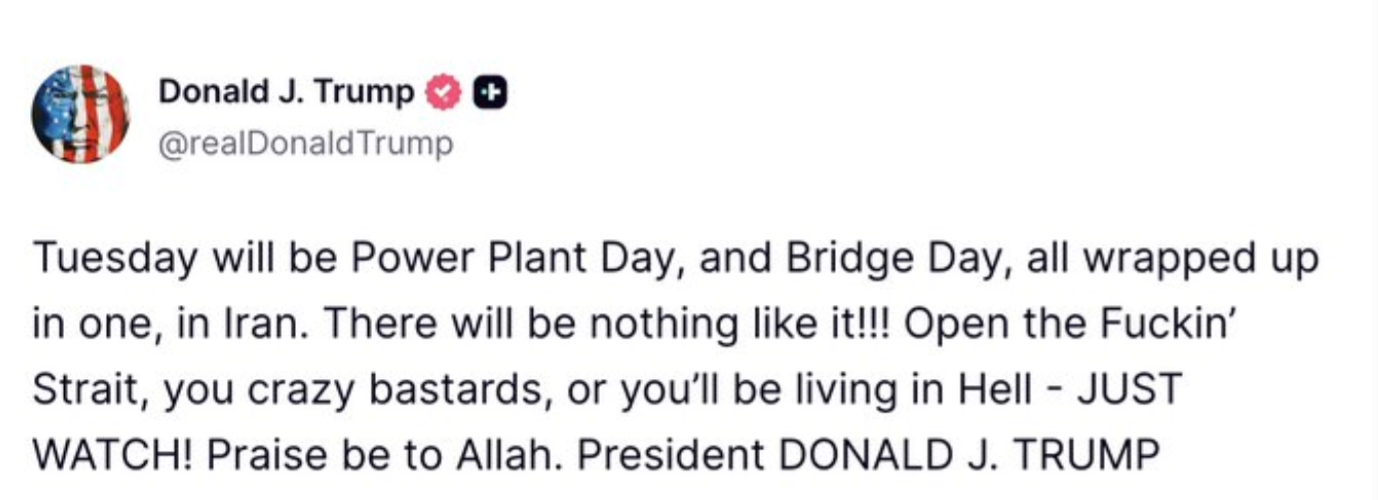 Donald Trump amenazó con bombardear plantas eléctricas y puentes en Irán si el régimen no reabría el Estrecho de Ormuz, en una declaración que marca la tercera ocasión en que advierte sobre ataques a infraestructura civil —acciones que podrían considerarse crímenes de guerra bajo el derecho internacional—; en paralelo, el presidente destacó como un logro militar el rescate de un piloto estadounidense derribado por fuerzas iraníes días antes, en medio de una escalada que combina retórica cada vez más agresiva con operaciones militares de alto riesgo. (TE)