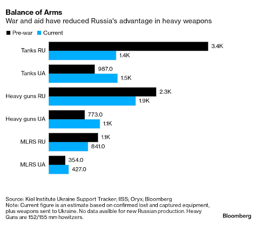 En combinación con un recuento de equipos perdidos o capturados compilado por el grupo de inteligencia Oryx, las cifras sugieren un cambio en el equilibrio de armamento en el campo de batalla, con la flota de tanques de Ucrania creciendo mientras que la de Rusia se ha reducido a la mitad. (BBG)