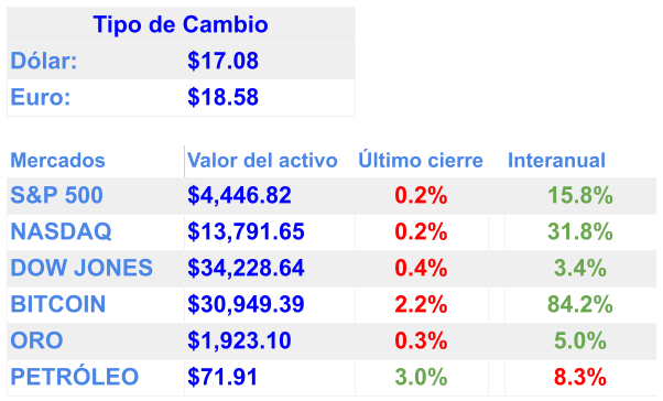 La Unión Europea compra capacidad en vacunas para prepararse ante la próxima pandemia / Los tres principales índices estadounidenses cayeron ligeramente ayer, los inversionistas digieren las actas de la reunión de la Reserva Federal, que apuntan a nuevas subidas en las tasas de interés. / El Presidente de Estados Unidos, Joe Biden, declaró recientemente que espera con "ansiedad" la entrada de Suecia en la OTAN, a pesar del actual veto de Turquía / Corea del Sur ha anunciado las mayores reformas del sector bancario coreano en más de 30 años, en un intento de impulsar la competencia / En México: AMLO se pondrá fin a la Importación de gasolinas en 2024 / Captan a Alcaldesa de Chilpancingo en reunión con presunto líder criminal Los Ardillos / Zuckerberg lanzó al competidor de Twitter: Threads / Bank of America (BofA) aumentó su dividendo en un 9% después de una prueba de estrés de la Fed / El explosivo crecimiento de ChatGPT registra su primer descenso de tráfico desde lanzamiento y acabamos de tener el día más caluroso del mundo jamás registrado, y los expertos dicen que sólo va a hacer más calor.