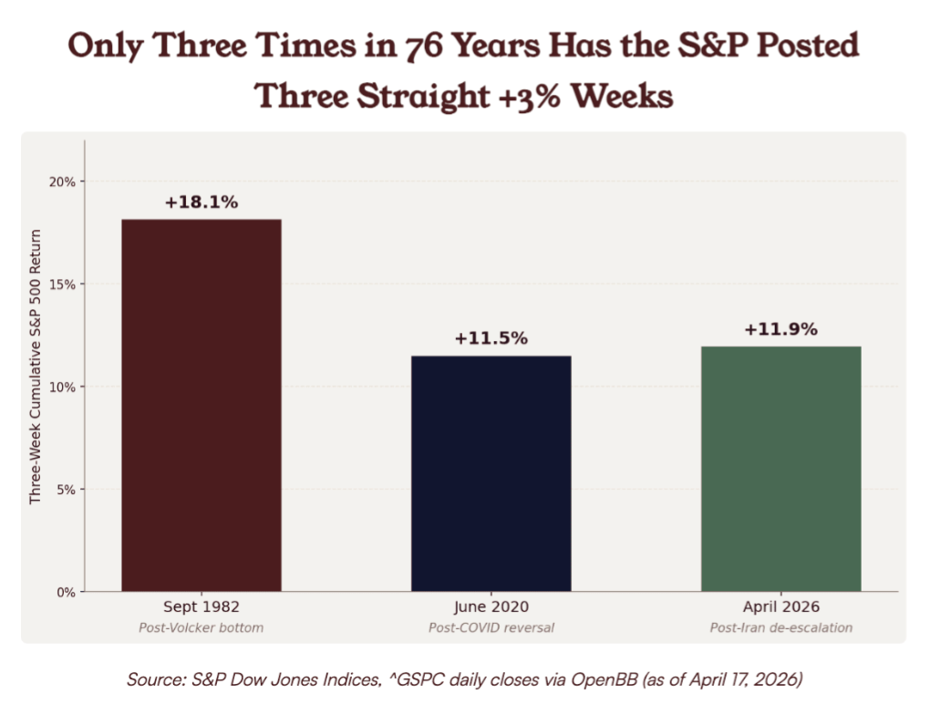 Más allá del ruido geopolítico, el S&P 500 está enviando una señal técnica muy poco común: acaba de registrar tres semanas consecutivas con alzas de al menos 3%, algo que, según ProCap Insights, solo había ocurrido dos veces desde 1950. En ambos precedentes —1982 y 2020— el índice entregó retornos de doble dígito en los 12 meses siguientes, lo que alimenta la idea de que el mercado podría estar preparándose para otro tramo alcista importante. El contexto reciente también ha ayudado: la expectativa de avances diplomáticos en torno a Irán y la caída del precio del petróleo han reforzado el apetito por riesgo en la bolsa estadounidense.