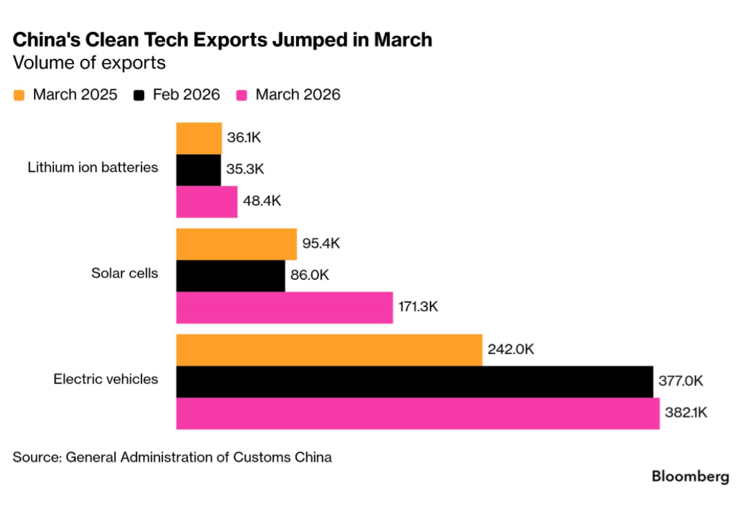Las exportaciones chinas de tecnología limpia se están consolidando como uno de los pocos motores que ganan velocidad justo cuando el comercio global empieza a resentir la volatilidad geopolítica. En marzo, los envíos de vehículos eléctricos de China crecieron 53% anual, los de baterías de ion-litio 34% y los de celdas solares 80%, una combinación que sugiere que, ante el encarecimiento y la fragilidad del suministro de combustibles fósiles, cada vez más países están acelerando su apuesta por electrificación, almacenamiento y generación alternativa. El dato es todavía más relevante porque llega en un mes en el que las exportaciones totales chinas solo avanzaron 2.5% anual, reflejando que la tecnología limpia no solo está resistiendo mejor el entorno externo, sino que empieza a funcionar como amortiguador estratégico frente al shock energético global.