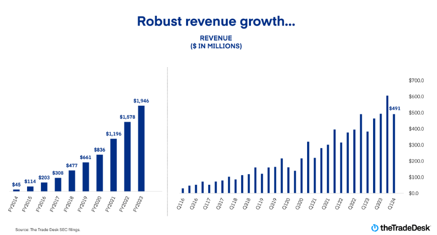 The Trade Desk ha logrado un crecimiento constante de dos dígitos a lo largo de sus casi ocho años desde que es pública. Incluso en 2020, cuando la pandemia debería haber alejado a los anunciantes de generar nuevos clientes potenciales, los ingresos de The Trade Desk aumentaron un 26%. El ingreso neto sufrió un golpe en 2022, el año en que las acciones cayeron, pero los ingresos aún aumentaron un robusto 32%.