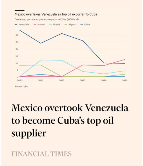 México desplazó a Venezuela y se convirtió en el principal proveedor de petróleo de Cuba en 2025, según datos de la industria reportados por Financial Times.