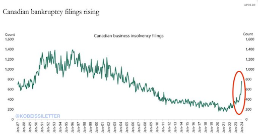 Las solicitudes de quiebra en Canadá se están disparando, con casi 800 solicitudes de quiebra solo en enero de 2024.