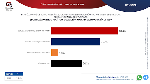 Encuesta de Covarrubias y Asociados: Sheinbaum 57%; Xóchitl 25%; Jorge Álvarez 4% y No sabe 14%. (HER)