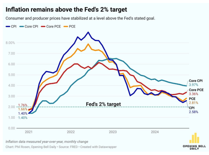 La inflación en Estados Unidos está lejos de enfriarse. El índice de precios de gastos de consumo personal (PCE), el indicador favorito de la Reserva Federal, subió en octubre a una tasa anual de 2.3%, mientras que el núcleo del PCE alcanzó el 2.8%, superando el 2.6% de julio. Otros indicadores clave, como el índice de precios al consumidor (CPI) y el índice de precios al productor (PPI), también mostraron aumentos en octubre, alejándose aún más del objetivo del 2% establecido por los responsables de la política monetaria. Según Quincy Krosby, estratega global de LPL Financial, la inflación “pegajosa” sigue complicando el camino hacia la estabilidad de precios.