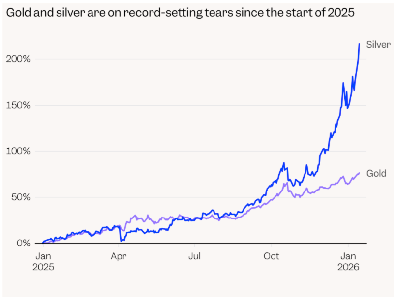 Muchos expertos creyeron que en 2026 el impulso se agotaría y que los inversionistas reconocerían lo sobreextendido del movimiento, pero ocurrió lo contrario: el oro y, sobre todo, la plata siguieron subiendo hasta nuevos récords; solo este miércoles la plata avanzó 6%. Desde inicios de 2025, el oro acumula +75% y la plata +220%.