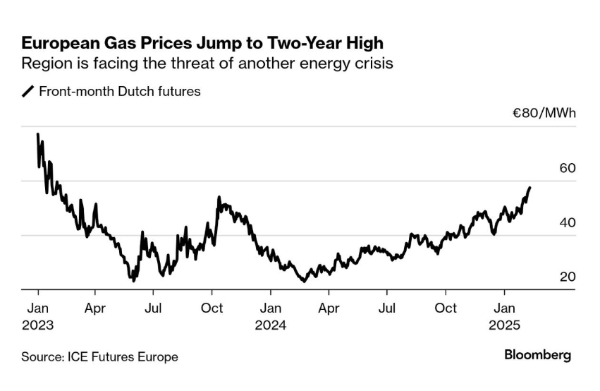Europa está al borde de una nueva crisis energética tras el aumento de los precios del gas natural, que alcanzaron su nivel más alto en dos años. Después de enfrentar el impacto de facturas elevadas, una inflación persistente y un debilitamiento de la actividad industrial desde la crisis de 2022, el continente enfrenta el riesgo de una nueva escalada de precios que podría agravar el deterioro económico. (BBG)