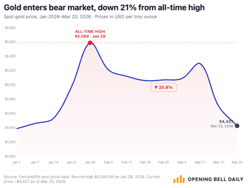 El oro ha entrado en un mercado bajista —con caídas superiores al 20% desde su máximo reciente— en un contexto que, en teoría, debería impulsarlo: una guerra en Medio Oriente. Sin embargo, la dinámica es más compleja. El conflicto con Irán elevó los precios del petróleo por encima de los 100 dólares, lo que reactivó temores inflacionarios y redujo las expectativas de recortes de tasas por parte de la Reserva Federal; en consecuencia, el aumento en los rendimientos reales hace que activos como el oro —que no generan intereses— pierdan atractivo relativo, explicando por qué el metal cae incluso en medio de alta tensión geopolítica.