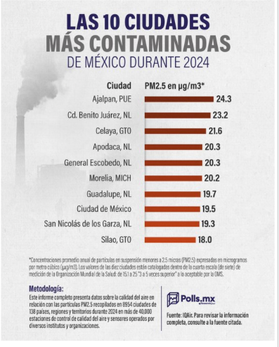 Un estudio de @IQAir mostró los lugares más contaminados de México en 2024. La OMS reportó que cada año, la contaminación del aire, tanto ambiental como doméstica, causa la muerte de miles de personas en el mundo.