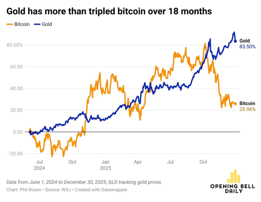 En 2025, el oro aplastó a bitcoin, pero la lectura cambia por completo cuando se amplía el horizonte. En los últimos 12 meses, el metal subió más de 63%, mientras bitcoin se encaminó a apenas su tercer año negativo de la última década, algo que sorprendió pese al entorno políticamente favorable en Estados Unidos, la flexibilización regulatoria, la demanda institucional y el auge de los fondos cotizados que replican bitcoin. Al mismo tiempo, el oro se benefició de una demanda constante tanto minorista como institucional, además de compras sostenidas por bancos centrales y gobiernos, reforzando su rol como refugio en un año dominado por incertidumbre macro.