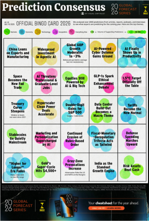 Aquí, visualizamos dónde coinciden más las previsiones de los expertos para revelar qué esperan los analistas y líderes de opinión para el próximo año.