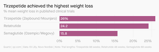 En ensayos clínicos se encontró que la tirzepatida, el ingrediente principal de Zepbound y Mounjaro de Eli Lilly, logra una pérdida de peso promedio del 26% en un año. (Quartz)