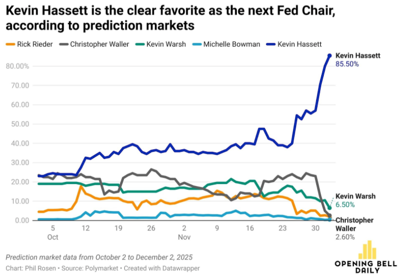 Los mercados cerraron con optimismo tras un repunte de las acciones, pero la verdadera atención quedó en la Casa Blanca cuando Donald Trump insinuó que Kevin Hassett podría suceder a Jerome Powell como presidente de la Reserva Federal. Hassett, hoy director del Consejo Económico Nacional, ha sido partidario —al igual que el presidente— de reducir las tasas de interés durante 2025. Según las apuestas en mercados de predicción, lleva meses como favorito frente a otros candidatos como los gobernadores Chris Waller y Michelle Bowman o el exfuncionario Kevin Warsh, y después del comentario de Trump sus probabilidades de nominación saltaron de 40% a 86%.