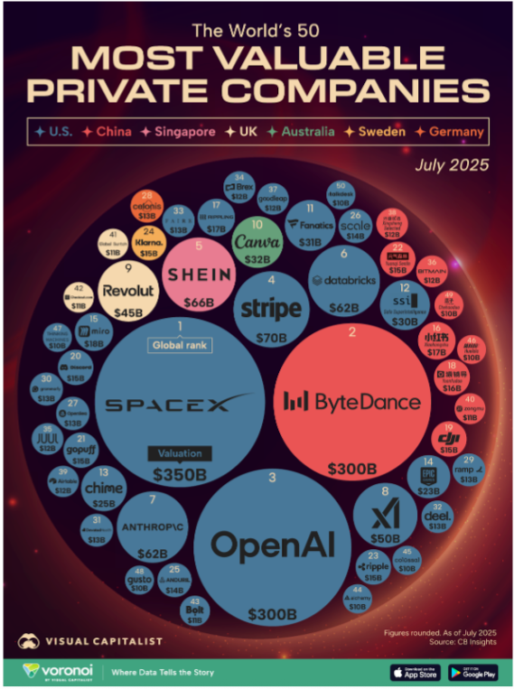En 2025, Estados Unidos concentra 31 de las 50 empresas privadas más valiosas del mundo, con un dominio creciente de la inteligencia artificial. Entre las mejor valoradas están OpenAI (300,000 millones de dólares), Anthropic (62,000 millones), xAI (50,000 millones) y Safe Superintelligence (30,000 millones). China ocupa ocho posiciones, liderada por ByteDance (300,000 millones) y seguida por referentes en tecnología de consumo y hardware como Xiaohongshu, DJI y Yuanfudao. SpaceX encabeza la lista global con 350,000 millones de dólares, acompañada por gigantes como Stripe, SHEIN, Databricks, Revolut y Canva. El auge de la inteligencia artificial ha transformado el top 10 y atraído inversiones récord, como demuestra Scale AI: tras vender 49% a Meta, su valoración subió a 29,000 millones, ubicándola entre las compañías privadas más valiosas del planeta. (Visual Capitalist)