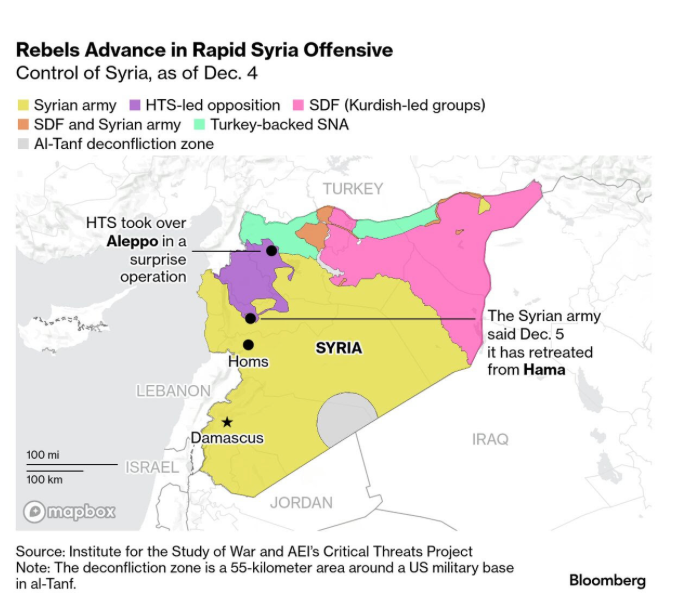 Las fuerzas rebeldes sirias continúan su avance hacia Damasco y se acercan a Homs, cuya captura podría aislar la capital de la principal ruta terrestre hacia el Mediterráneo. Tras la pérdida de Alepo, el ejército sirio también cedió el control de la ciudad de Hama, intensificando la amenaza al poder del dictador pro-ruso Bashar al-Assad. (BBG)