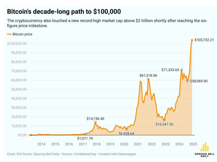 Bitcoin alcanzó los $100,000 por primera vez esta semana, impulsado por un entorno favorable tras la victoria de Donald Trump, quien ha promovido políticas pro-cripto y nominado a defensores de las criptomonedas para puestos clave, como Paul Atkins en la SEC. Además, comentarios de Jerome Powell, presidente de la Reserva Federal, comparando a Bitcoin con el oro digital, han reforzado el optimismo en el mercado. Desde el 5 de noviembre, el valor del mercado de criptomonedas ha aumentado en más de $1.3 billones, con analistas señalando un panorama favorable gracias a preocupaciones sobre la deuda de Estados Unidos, tensiones geopolíticas y un entorno de mayor liquidez.