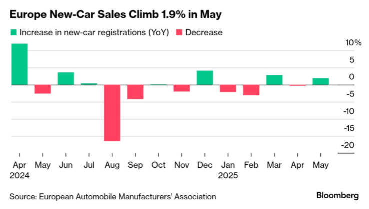 El mercado automotriz europeo mostró una leve recuperación en mayo, impulsado por la sólida demanda de vehículos eléctricos e híbridos, que logró compensar en parte el impacto de una economía desigual y las tensiones comerciales globales. Sin embargo, Tesla sigue perdiendo terreno en Europa: sus entregas cayeron 28% en comparación anual, afectadas por el aumento de la competencia y, según todo indica, por las controvertidas actividades políticas de su director ejecutivo, Elon Musk, que estarían debilitando el apetito de los consumidores. (BBG)