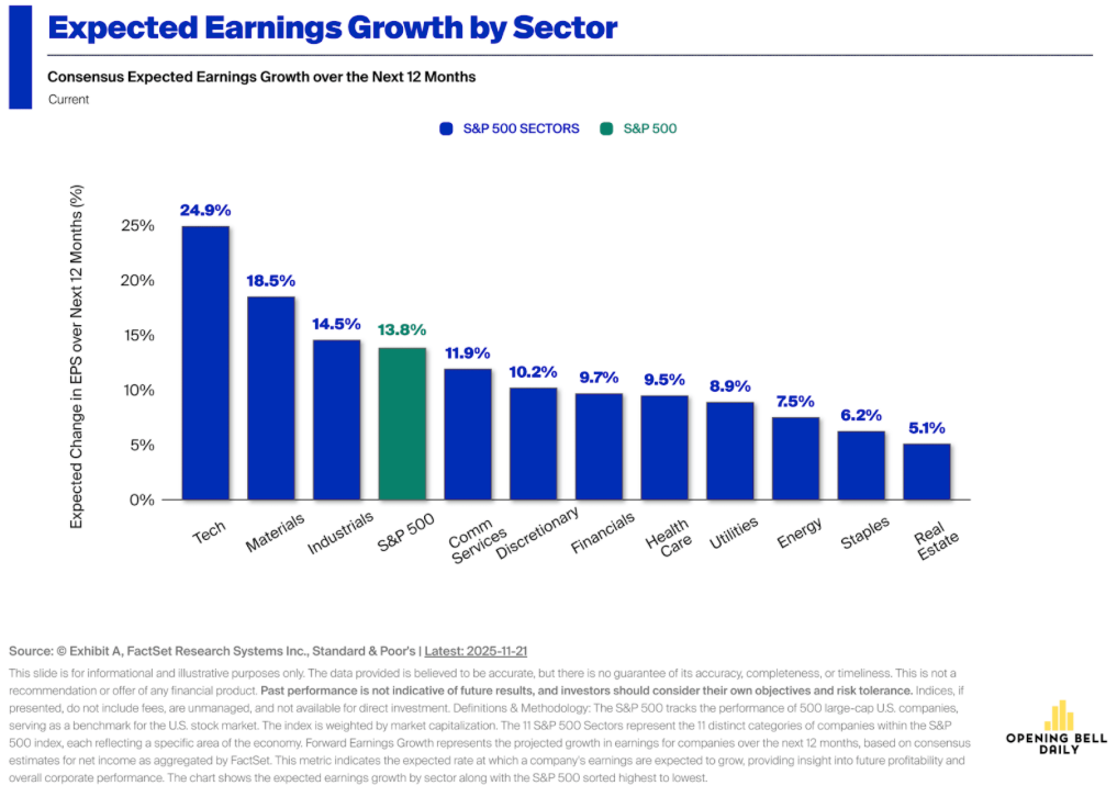 El repunte tecnológico de finales de año refleja un cambio de expectativas más que un salto inmediato en los resultados. A pesar de que las siete grandes compañías tecnológicas (magnificent 7) cerraron el tercer trimestre con su crecimiento de utilidades más débil en más de dos años, las proyecciones apuntan a un ciclo de aceleración sostenida a lo largo de 2025 y 2026. Los analistas esperan que este grupo retome un ritmo ascendente en ingresos y beneficios, impulsado por la mayor demanda de servicios de inteligencia artificial, nuevas arquitecturas de cómputo y un entorno en el que las estimaciones adelantadas pesan más que los datos recientes. Excluyendo el impacto extraordinario del cargo fiscal de Meta, el grupo ya mostró un crecimiento de utilidades del 30.4% anual, muy por encima del 11.9% del resto del índice, mientras que los pronósticos apuntan a tasas consistentes entre 18% y 24% en los próximos cuatro trimestres.