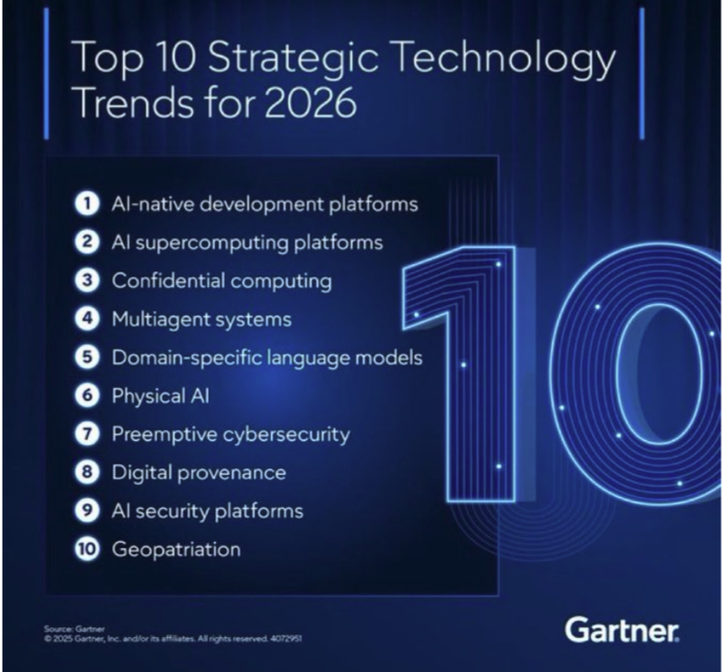 Estas son algunas de las tendencias tecnológicas estratégicas que marcarán la segunda mitad de la década y que comienzan a redefinir la arquitectura competitiva de las organizaciones. (1) Plataformas de desarrollo nativas de inteligencia artificial: entornos creados para diseñar software con inteligencia artificial en el centro, reduciendo radicalmente los tiempos de innovación. (2) Plataformas de supercómputo para inteligencia artificial: infraestructura de altísimo rendimiento que permitirá entrenar modelos cada vez más complejos y acelerar descubrimientos científicos y empresariales. (3) Cómputo confidencial: tecnología que posibilita analizar información sensible mientras permanece cifrada, facilitando colaboraciones seguras entre empresas y gobiernos. (4) Sistemas multiagente: redes de agentes autónomos capaces de coordinarse para ejecutar procesos completos, automatizando operaciones y elevando la productividad. (5) Modelos lingüísticos especializados por industria: inteligencia artificial entrenada con datos sectoriales —como salud, finanzas o derecho— que superará en precisión a los modelos generalistas y se convertirá en un activo estratégico.