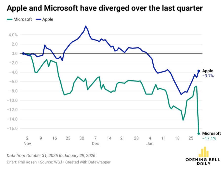 Los resultados más recientes de Apple y Microsoft están comenzando a fracturar la narrativa de que las grandes tecnológicas son una apuesta homogénea a la inteligencia artificial. Durante años, el mercado trató a este grupo (los “Margnificos 7”) como un solo trade, pero los últimos reportes sugieren la aparición de una competencia en dos carriles. Microsoft registró una caída superior al 10% —su peor reacción bursátil en una década tras resultados— luego de revelar un gasto de capital cercano a 37,500 millones de dólares en el trimestre, un salto anual de 66%. Aunque superó expectativas financieras, el mercado castigó la magnitud de la inversión, reflejo del creciente escepticismo hacia los proyectos de infraestructura de inteligencia artificial que consumen enormes recursos antes de generar retornos visibles.