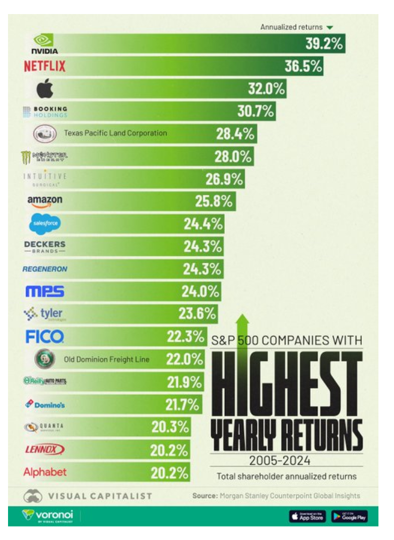 Las empresas del S&P 500 con mejor rendimiento anualizado de los últimos 20 años.