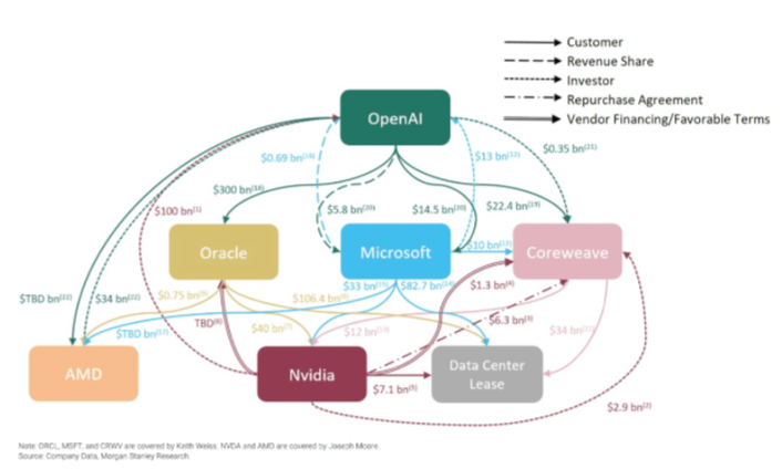 La economía de la inteligencia artificial se ha convertido en un ecosistema cerrado, donde los principales actores son simultáneamente clientes, proveedores e inversionistas unos de otros. Nvidia vende los chips que alimentan a OpenAI, pero también invierte 100 mil millones de dólares en la compañía; Microsoft es a la vez su principal accionista y usuario; AMD intercambió 34 mil millones en warrants por el uso de sus procesadores; y Oracle financia parte de la infraestructura que, a su vez, depende de los chips de Nvidia. Este entrelazamiento financiero ha creado lo que Morgan Stanley llama una “circularidad estructural”: un sistema donde los flujos de capital, deuda y propiedad se retroalimentan y difuminan las fronteras entre quién financia, produce o compra.