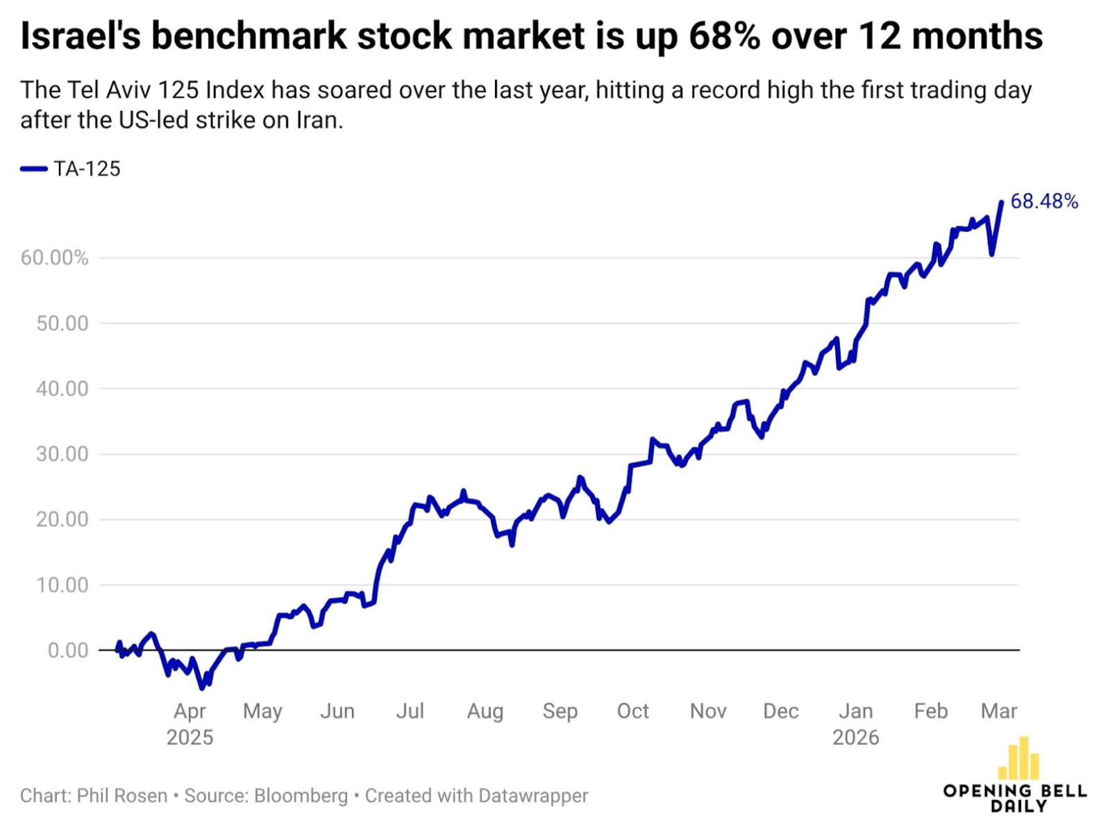 La bolsa de Israel continúa marcando máximos históricos pese a la escalada con Irán, reflejando una apuesta de los inversionistas por un entorno regional más estable en el mediano plazo. El índice TA-125 (principal índice bursátil de la Bolsa de Valores de Tel Aviv, que agrupa a las 125 empresas de mayor capitalización en Israel) avanzó más de 4.6% para alcanzar un récord y acumula un rendimiento superior a 14% en lo que va del año y más de 66% en los últimos doce meses. El movimiento sugiere que los mercados interpretan el actual intercambio de misiles no como el inicio de una catástrofe prolongada, sino como un posible punto de inflexión que podría debilitar la influencia iraní y reducir el descuento geopolítico que durante años pesó sobre los activos israelíes. Las valuaciones en sectores como defensa, energía y financiero reflejan una reasignación estratégica del riesgo y mayores expectativas de estabilidad y flujos de capital.