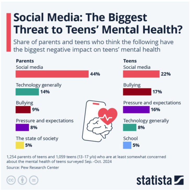 Según una encuesta realizada por el Pew Research Center a adolescentes estadounidenses en otoño de 2024, el 48 % de los estadounidenses de entre 13 y 17 años afirma que las redes sociales tienen un efecto mayoritariamente negativo en las personas de su edad, frente a tan solo el 32 % dos años antes.