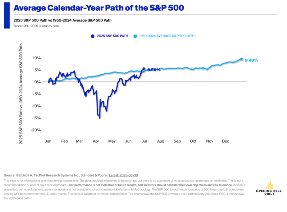 Los mercados parecen haber dejado atrás los temores de recesión y se comportan como si los tiempos de bonanza fuesen inevitables. Con el tercer trimestre en marcha, el S&P 500 no solo supera su promedio histórico, sino que lo hace en varios niveles de análisis. A la tradicional fortaleza estacional de julio —que suele ser el mejor mes en años post-electorales con un retorno promedio de 7.9% desde 1950— se suma el optimismo por los posibles recortes de tasas de la Reserva Federal, el alivio frente a las tensiones comerciales y un entorno macroeconómico más benigno de lo previsto. Hasta ahora, el índice acumula un avance cercano al 5.5% en el año, superando el promedio histórico de la primera mitad del calendario.